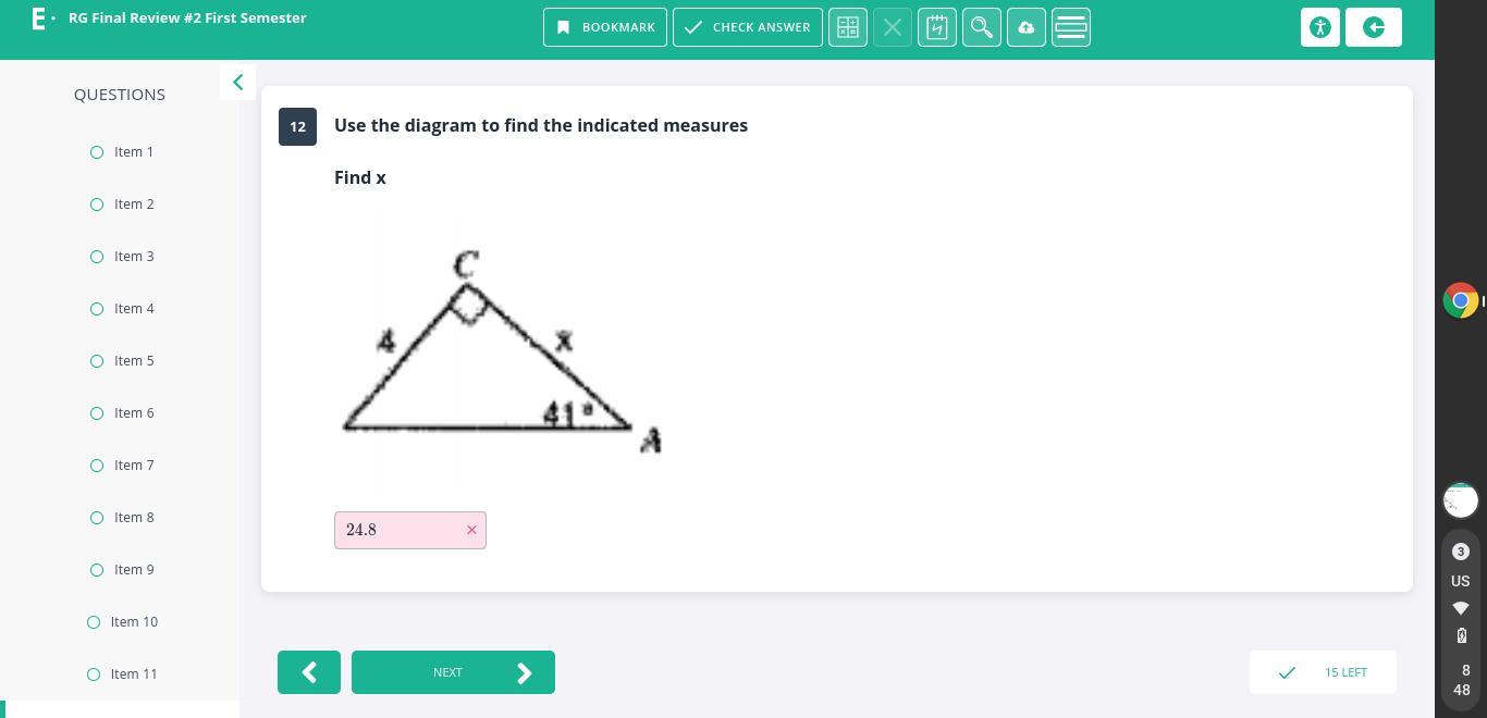 This means that the angle on the left is (3*40) + 15, or 135 degrees, while the angle on the right is 45 degrees. These angles add to 180 degrees.