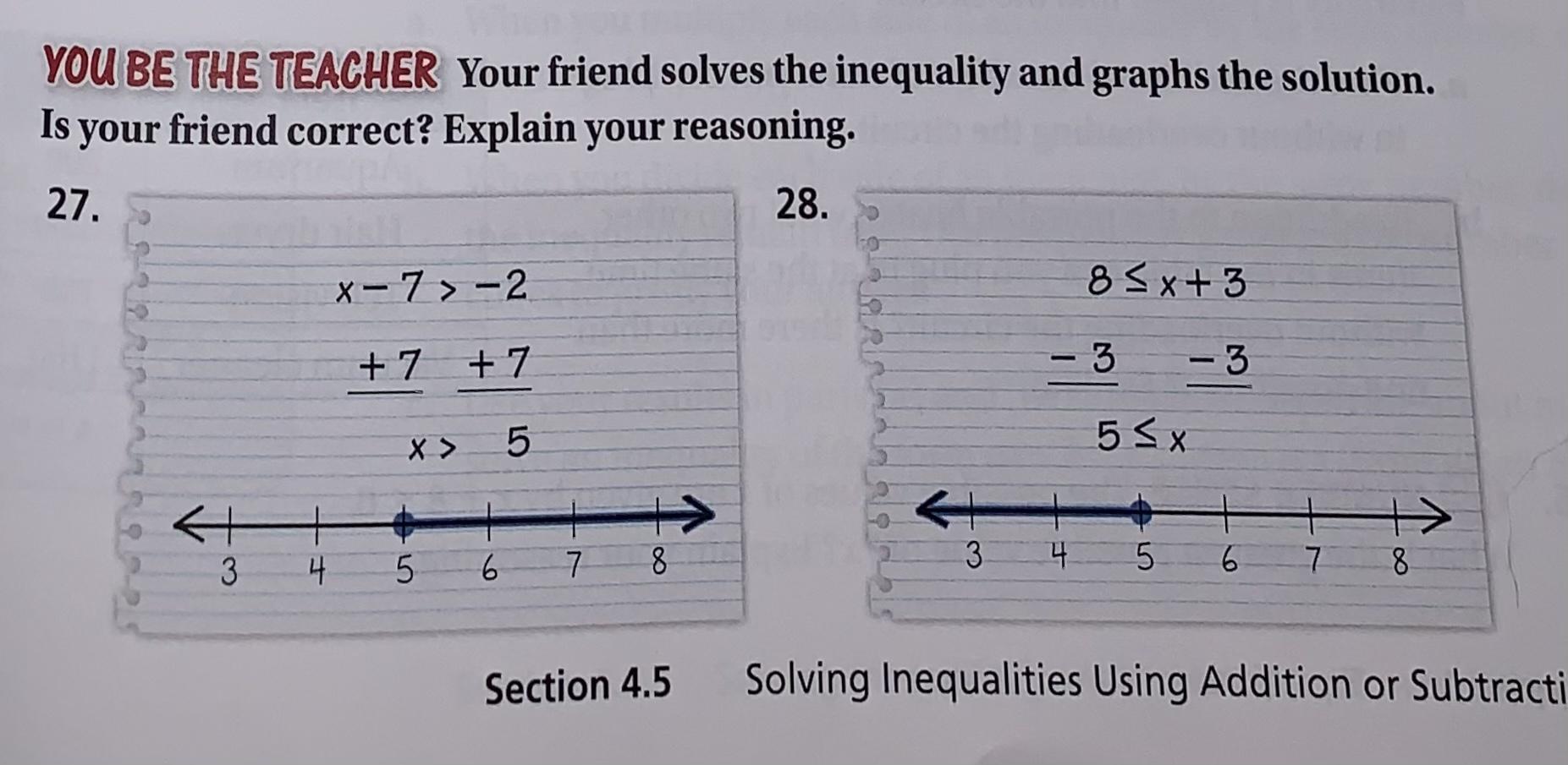 28. My friend is incorrect for both solving the inequality and graphing. The correct answer for solving the inequality would be "5 ≥ x ". And for graphing the correct answer would be closed circle to the right since the symbol is greater than.