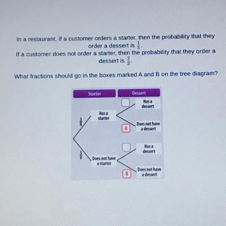 so, if they had a starter then the probability of not ordering dessert is 1 - 1/5 = 4/5 = A.