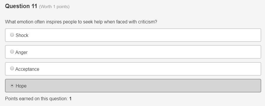 The emotion hope often inspires people to seek help when faced with criticism. This is because after you accept something, you understand what you are told and have taken another's words into consideration. Therefore, someone would most likely seek for help after feeling hopeful in understanding what they did wrong or incorrectly and that he or she can fix their issue.
