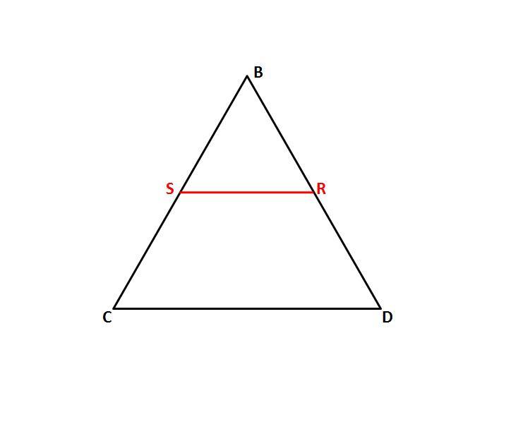 Line RS intersects triangle BCD at two points and is parallel to segment DC. Triangle B C D is cut by line R S. Line R S goes through sides D B and C B. Lines DC and RS are parallel. width= Which statements are correct? Select three options.