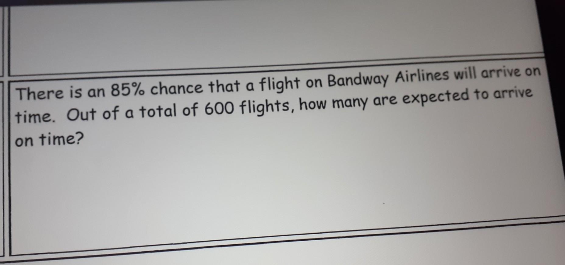 85% are expected to arrive on time, so we can convert that to a decimal, which is 0.85. (To convert a percentage to a decimal we can divide by 100.)