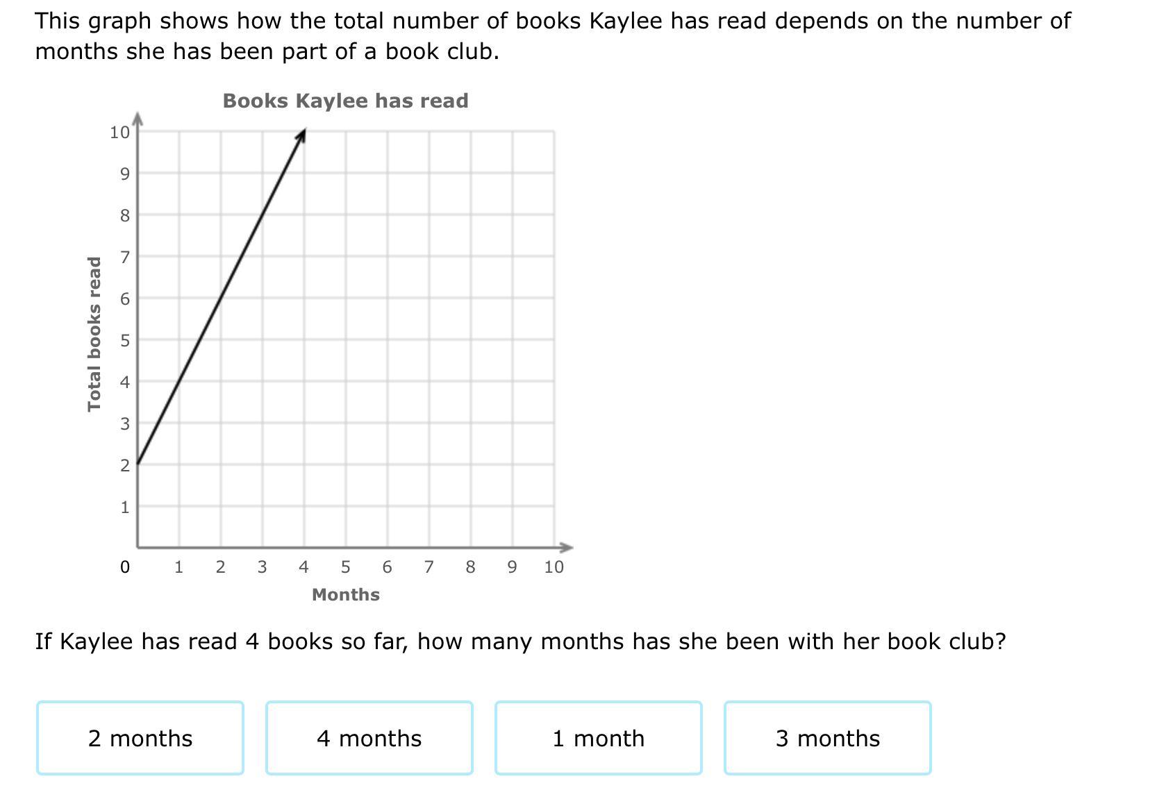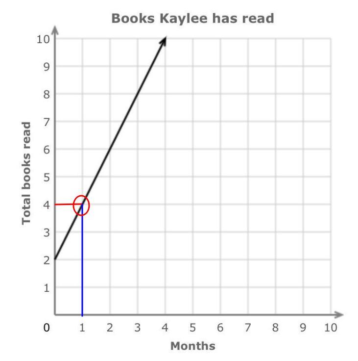 The question gives you the value on the y-axis (books read), so all you need to do is find the value of x that corresponds to that point on the line. I marked that point on the line in the attached image. Look directly below that point on the line, and you can see that 1 month corresponds to 4 books read.