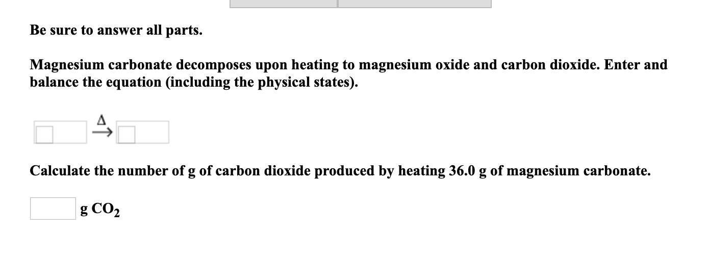 Mg C03 (white solid) ---> C02 (gas) + Mg= (solid)