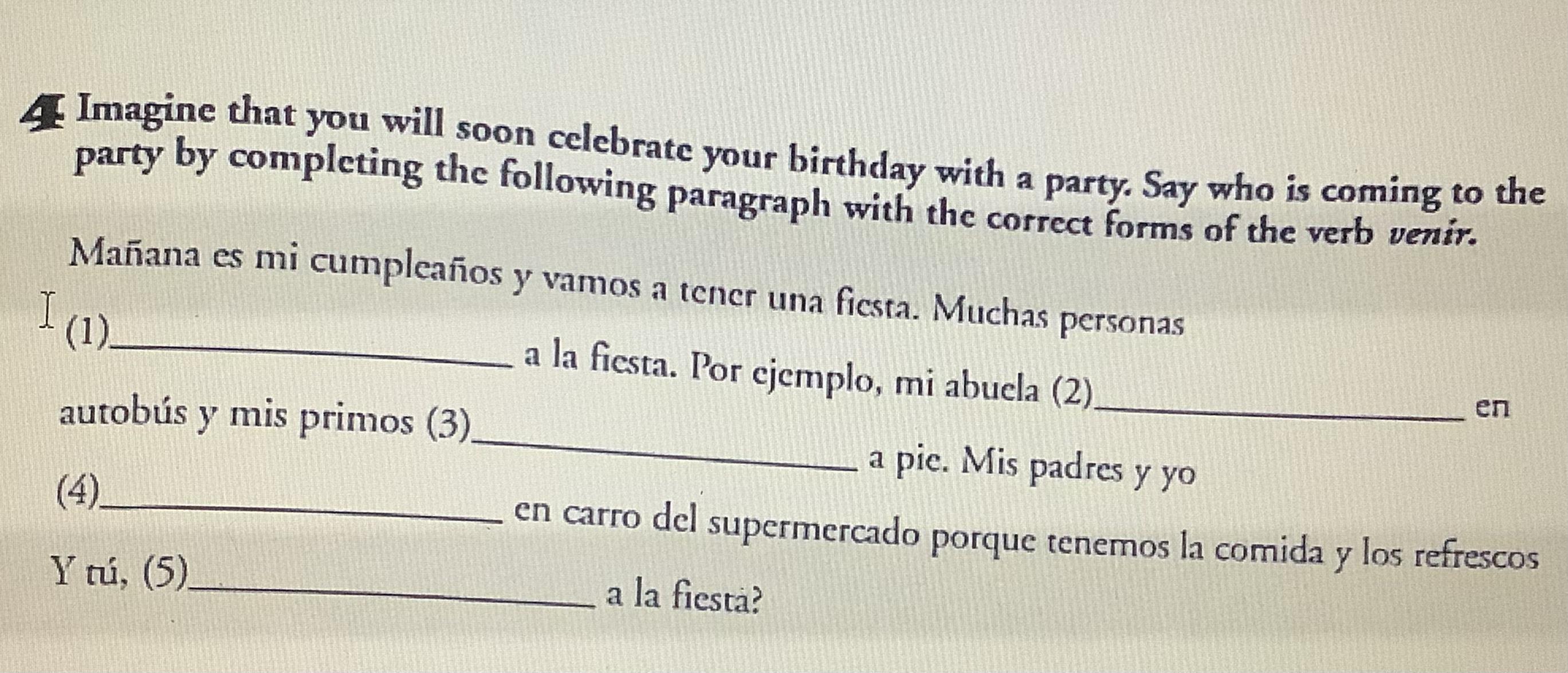 Mañana es mi cumpleaños y vamos a tener una fiesta. Muchas personas <u>vendrán</u> a la fiesta. Por ejemplo, mi abuela <u>vendrá</u> en autobús y mis primos <u>vendrán</u> a pie. Mis padres y yo <u>vendremos</u> en carro del supermercado porque tenemos la comida y los refrescos, Y tú, ¿<u>Vendrás</u> a la fiesta?