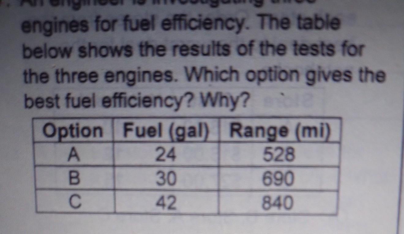 We find the greatest miles per gallon (best efficiency) is given by Option B.