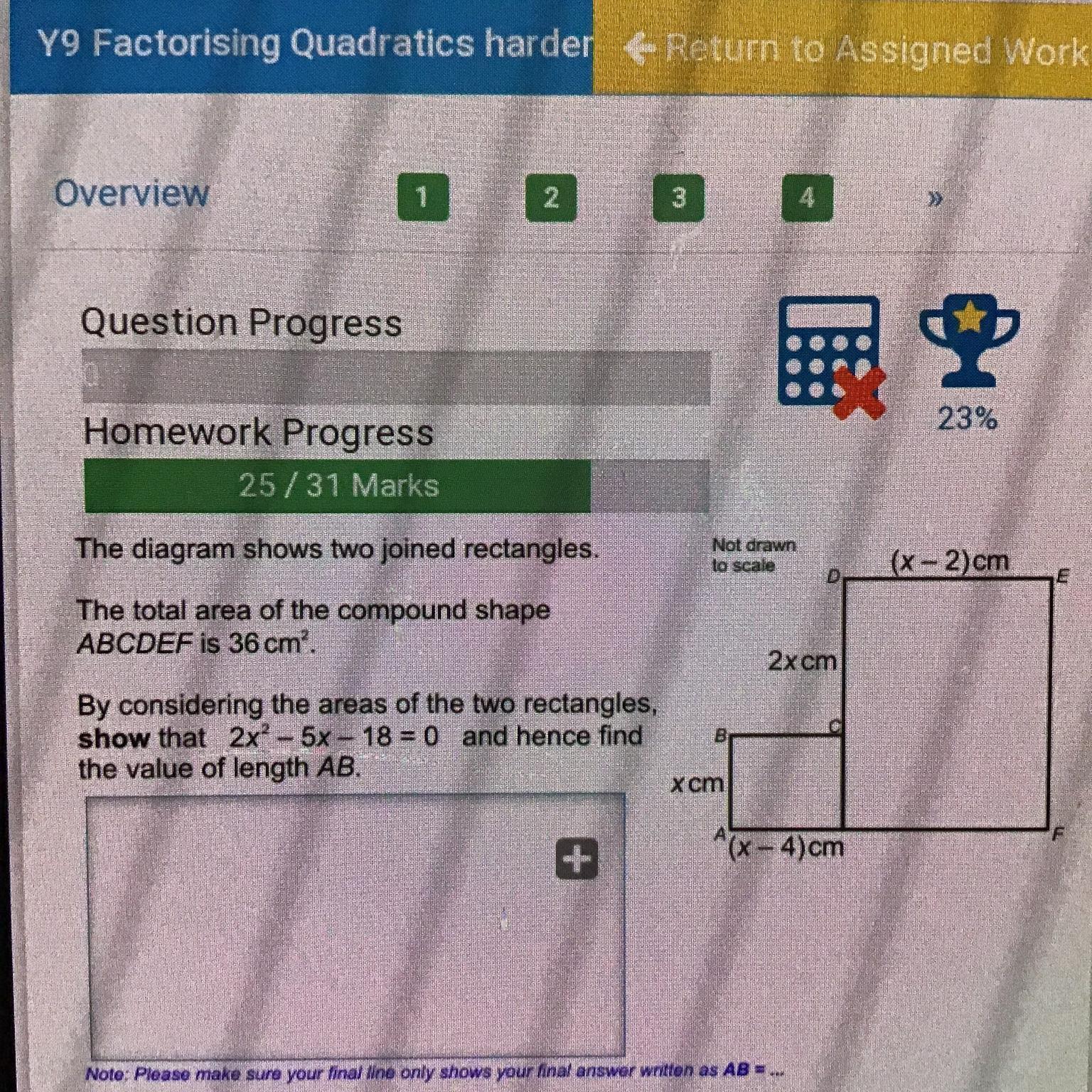 To find the length of AB (x), solve the quadratic by either factorising, completing the square or by using the quadratic formula, etc to solve for x.