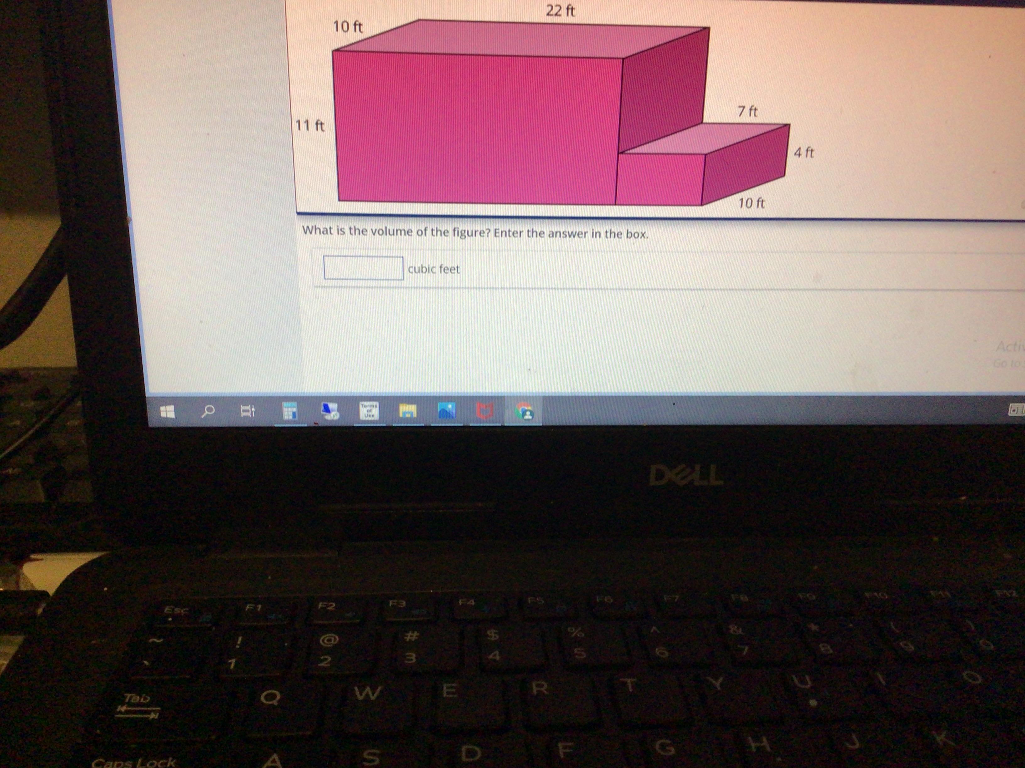 First, you’re going to want to multiple 11 by 10 by 22, this helps you find the volume of the large rectangle. Then, you’re going to multiple 7 by 4 by 10, this helps you find the volume of the small rectangle. Finally, add those two numbers together and you get the total volume. When calculating the volume of rectangles, remember that you are multiplying length by height by depth. Hope this helps!