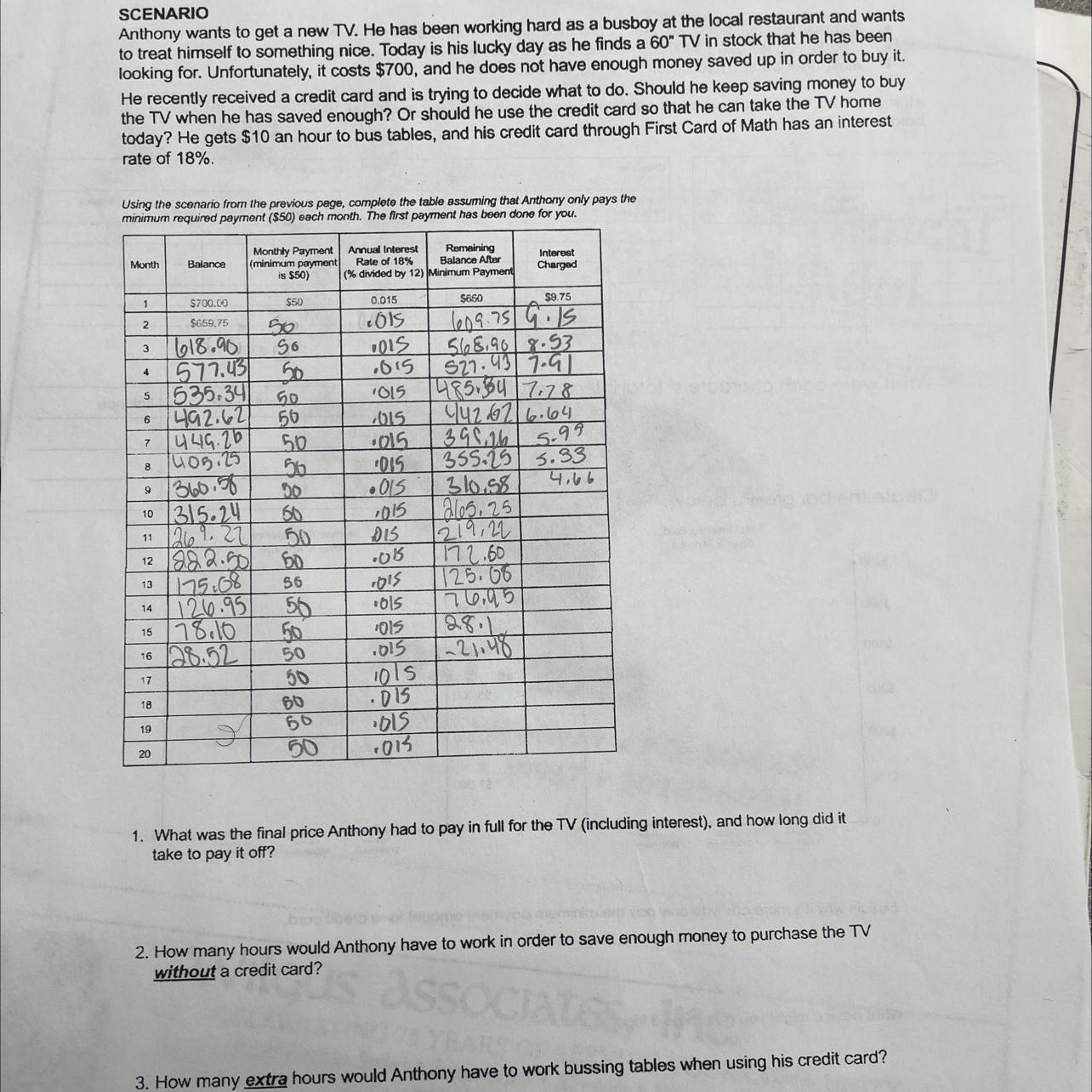 - 2. Anthony has to work for <u>70 hours</u> to save enough money to buy the TV