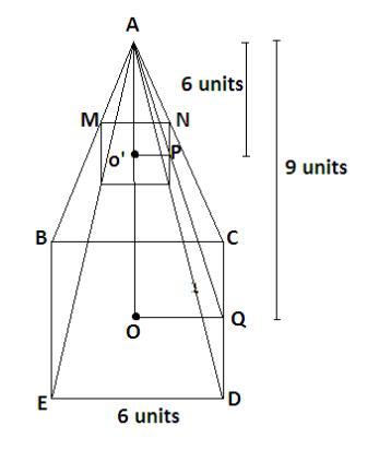 From the figure attached we have to calculate the volume of the frustum formed by cutting off a square pyramid from the top.