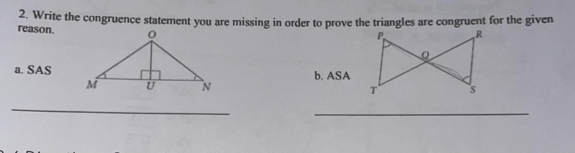 For part b, we have a pair of vertical angles which means they are congruent and <F and <S are congruent. For ASA, we need two angles and the included side of one triangle congruent to two angles and the included side of a second triangle.