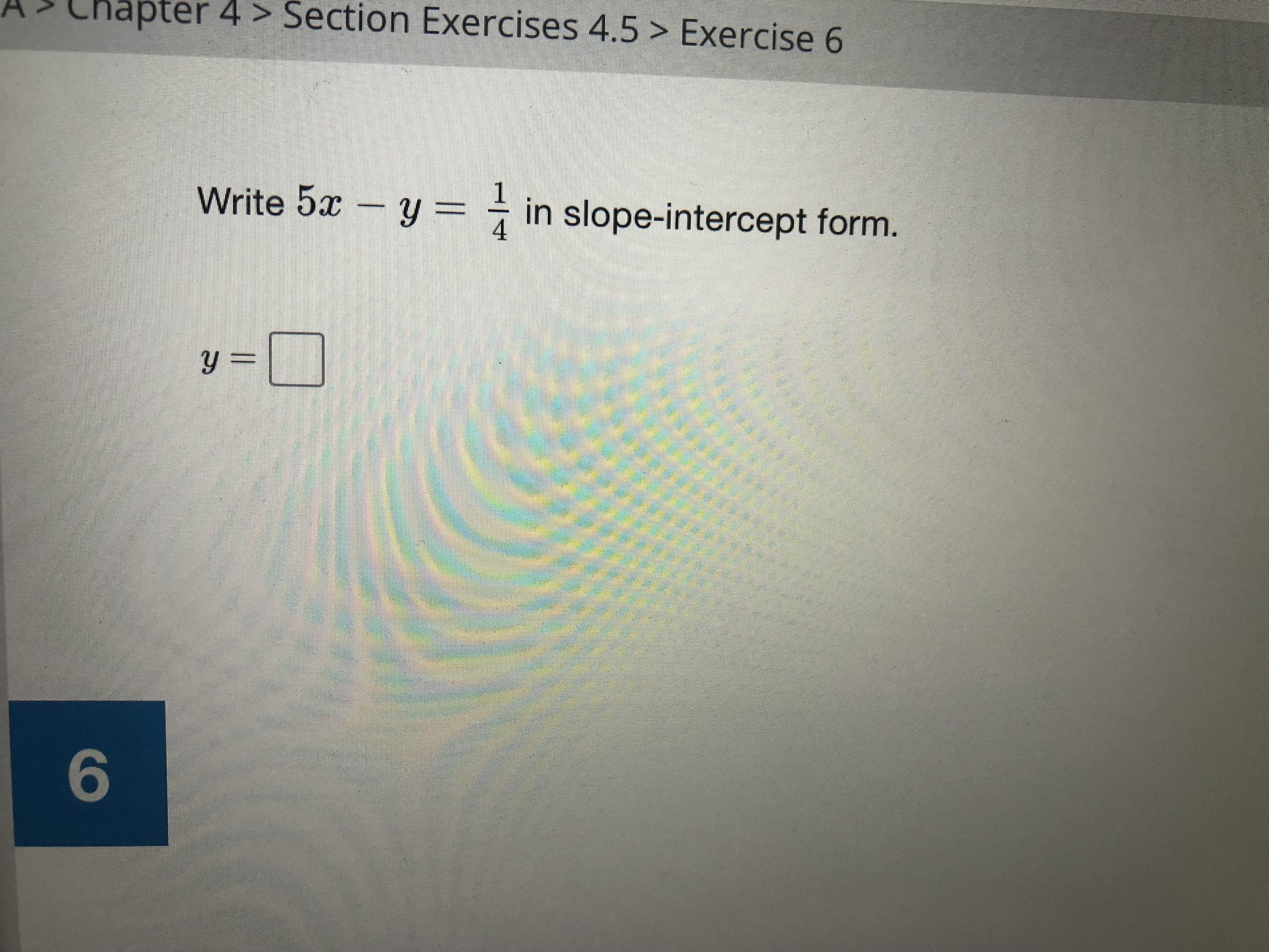 Your question is asking us to write 5x-y=1/4 in SLOPE INTERCEPT form.