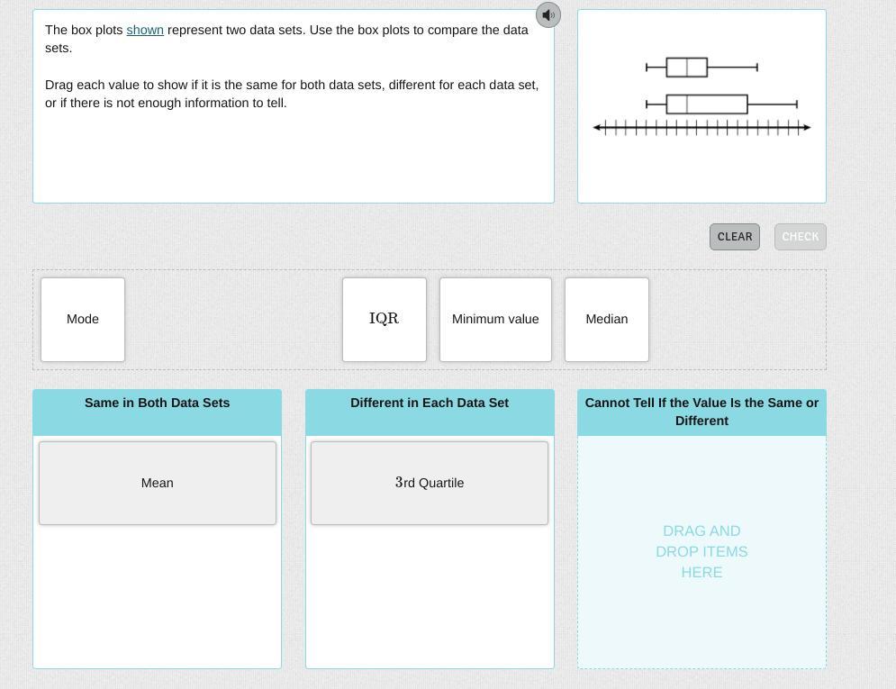 Minimum: This is the value that is the <em>least. </em>We can tell this from a box plot, by looking at the most left line, or the "whiskers", as some teachers call them. For our box plots, the minimum is 4. They line up exactly. Therefore, this box should go in the first category.