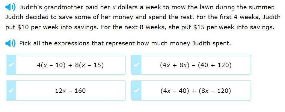 Judith decided to save some of her money and spend the rest. For the first 4 weeks, Judith put $10 per week into savings. For the next 8 weeks, she put $15 per week into savings.