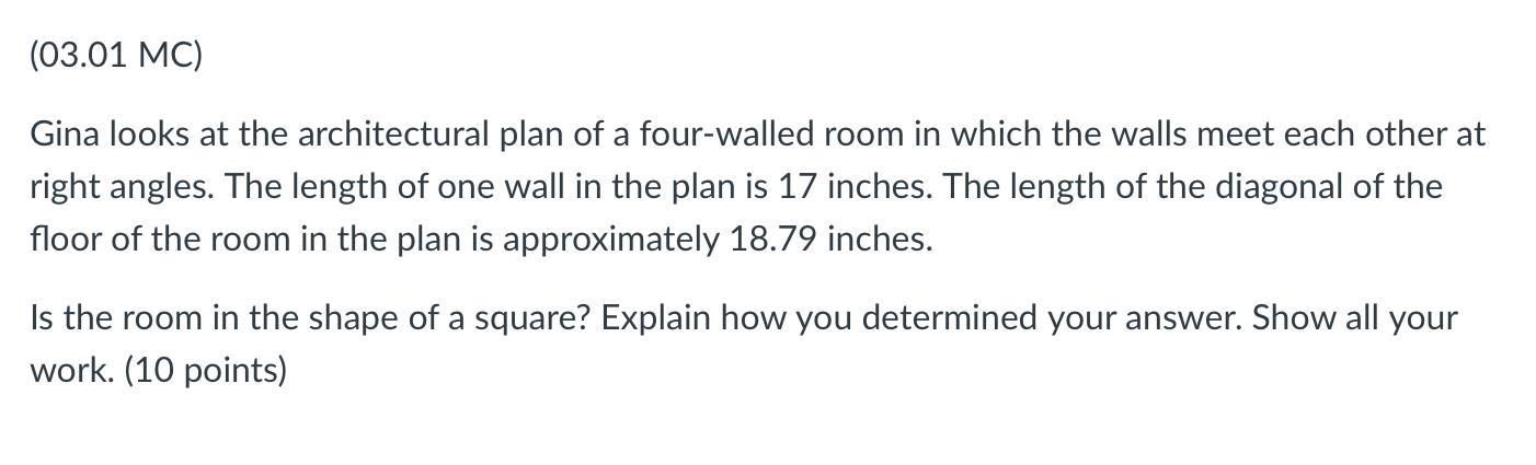 wall in the plan is 17 inches. The length of the diagonal of the floor of the room in the plan is approximately 18.79 inches. Is the room in the shape of a square? Explain how you determined your answer. Show all your work. (10 points)
