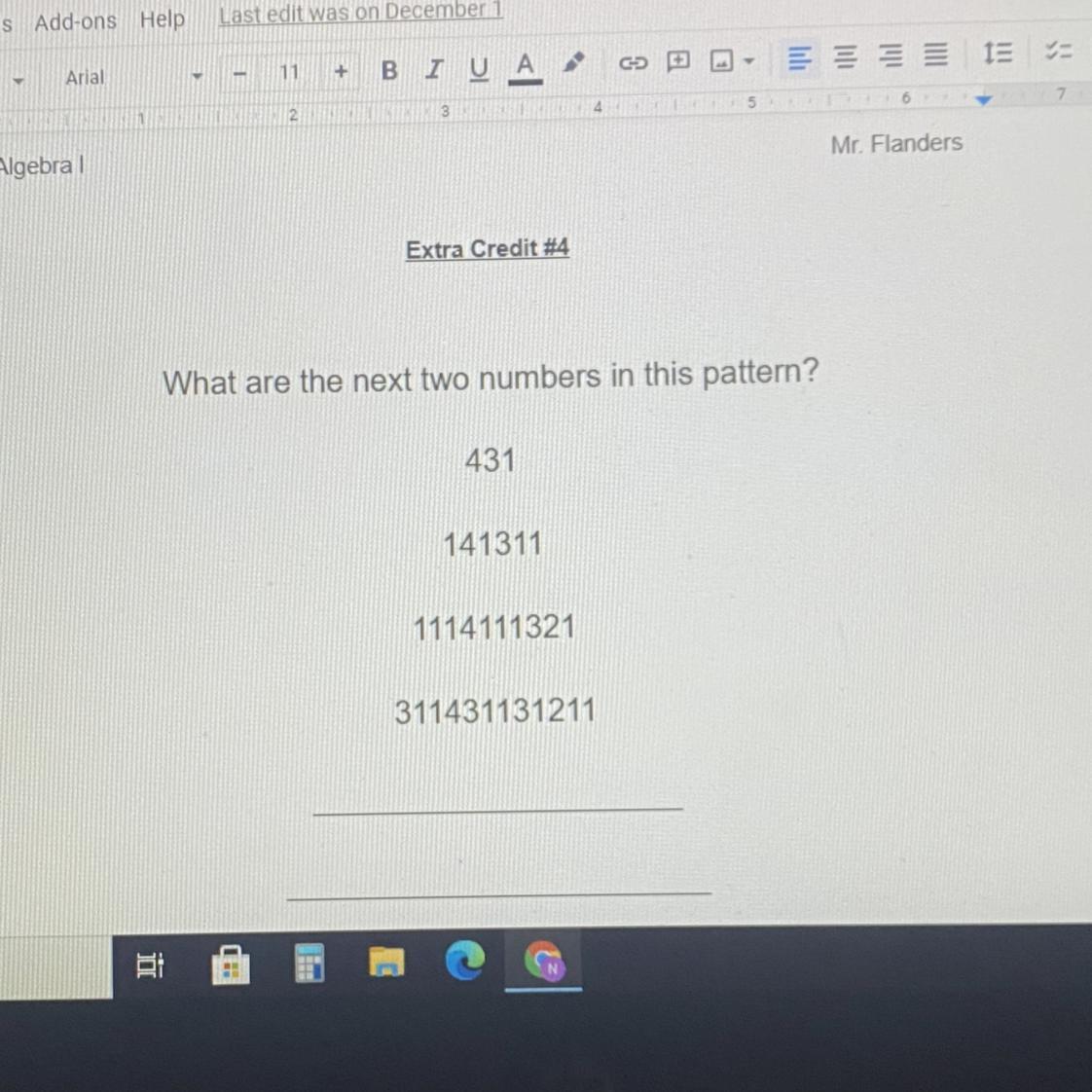 311431131211 (three consecutive 1s becomes 31, one 4 becomes 14, 3 more consecutive 1s becomes 31, one 3 becomes 13, one 2 becomes 12, and one 1 becomes 11 -> looking at each digit of the previous number, 1114111321)