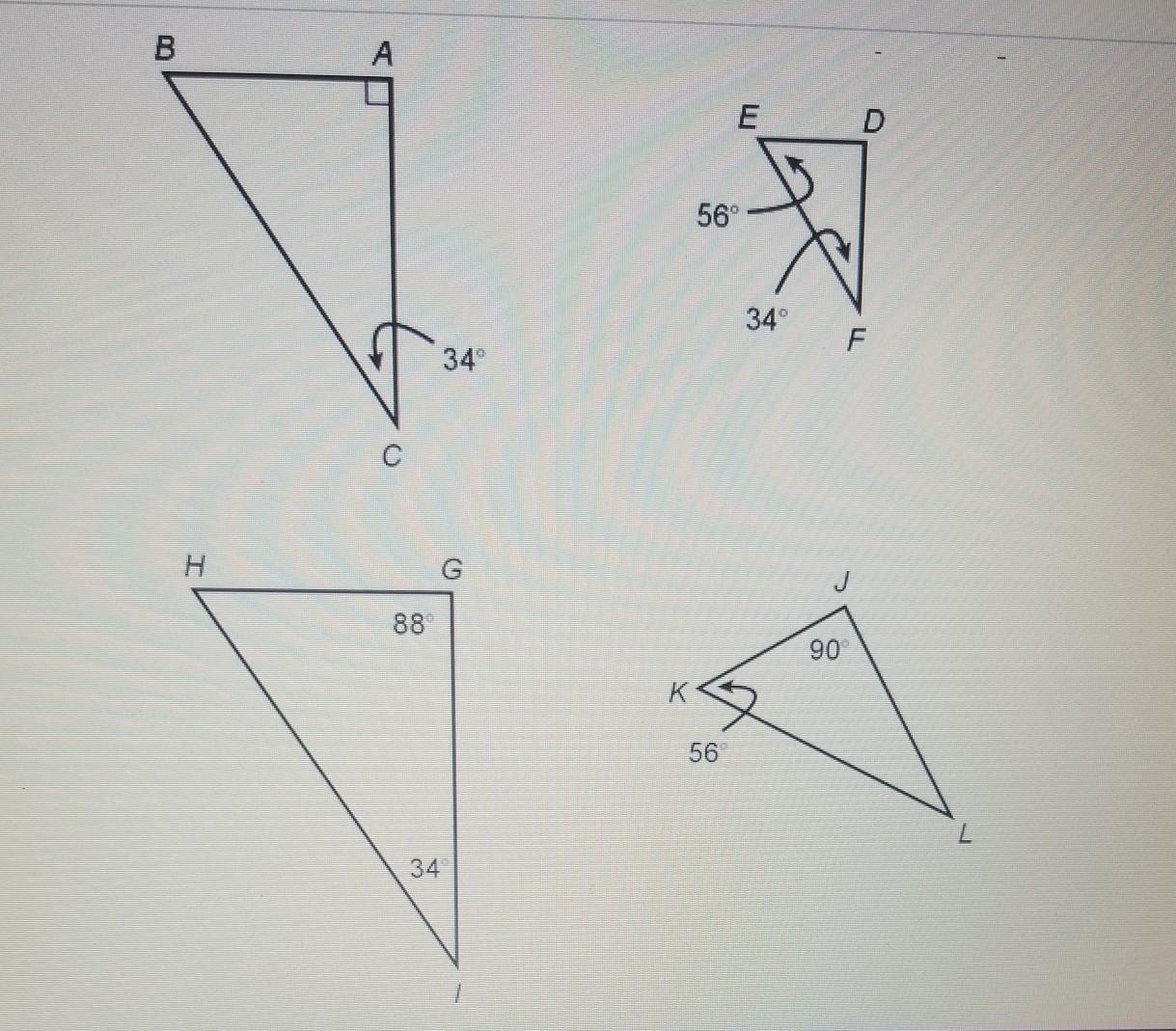 3 triangles are similar - the odd one out is the triangle with 88* angle.