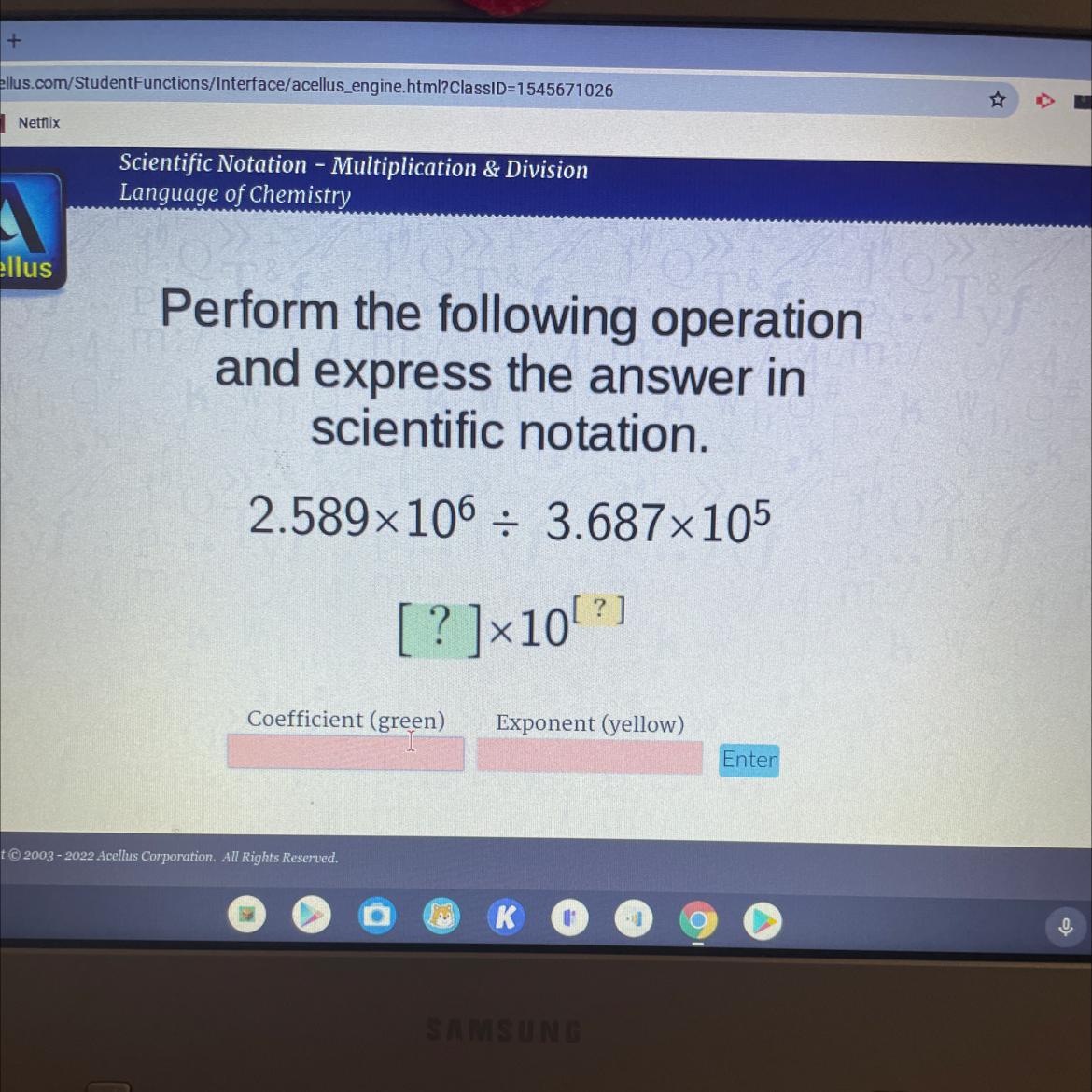 2.589 \times  {10}^{6} \div 3.687 \times  {10}^{5}  \\  = 2589000 \div 368700  \\  = 7.0219 \\ or \: 0.70219 \times {10}^{1}  = 0.70219 \times 10