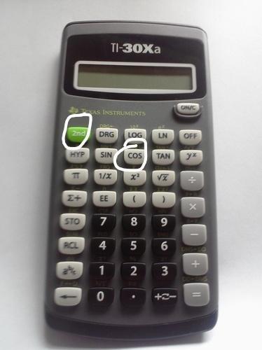 In your calculator, depending on what type you have, there should be a button that says 2nd. There should also be a button that reads cos, which is cosine.