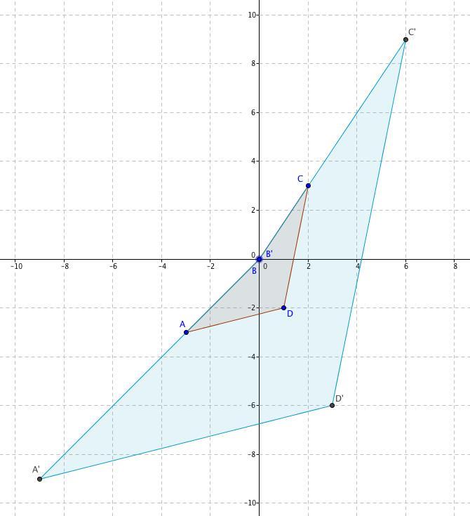 Dilation centered at the origin by a scale factor of 3 multiplies every coordinate by 3.