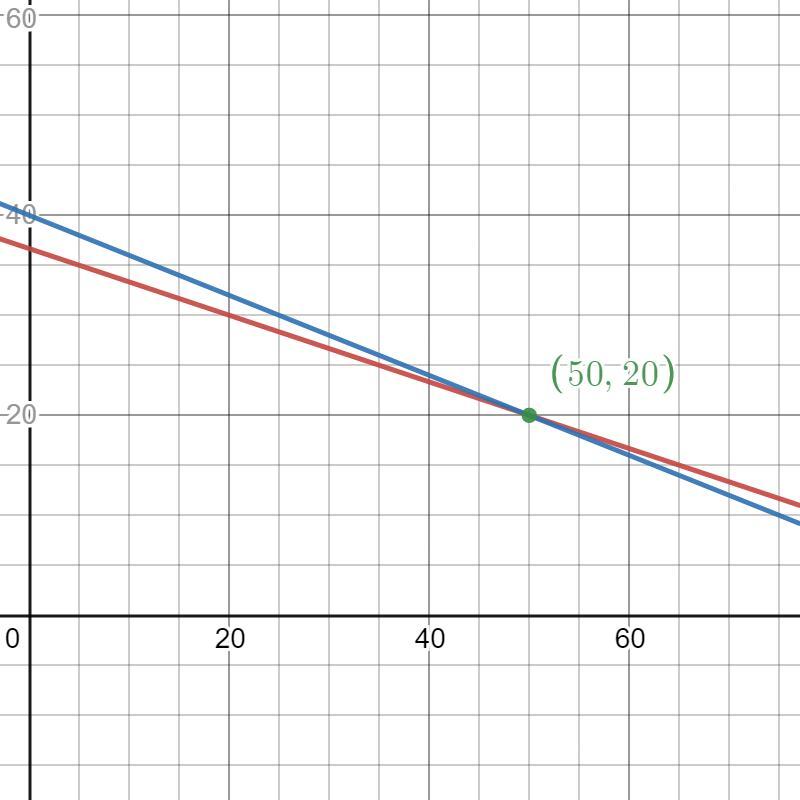 The point of intersection represents the solution found analytically and represents the scenario in which the <em>same</em> quantity of adults and children assisted to both shows.