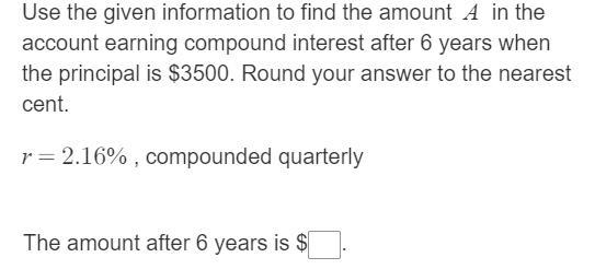 The <u>total amount</u> accrued, principal plus interest, with compound interest on a principal of <u>$3,500.00</u> at a rate of <u>2.12% per year</u> compounded <u>4 times per year</u> over <u>6 years</u> is <u>$3,973.42</u>.