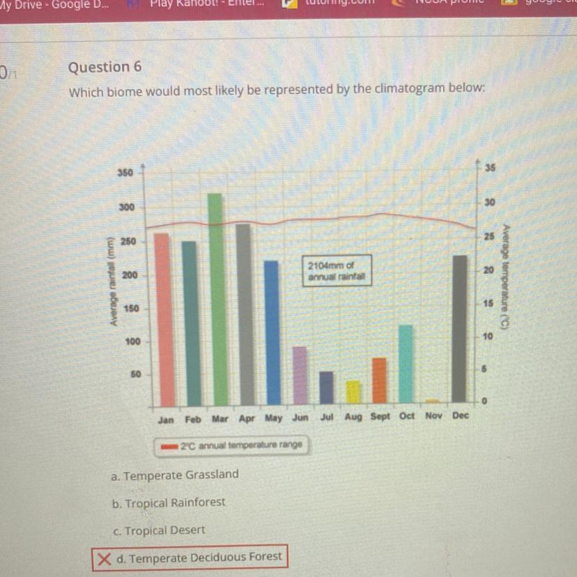 Knowing this information, we can also see on the graph that there had been approximately 2100mm of rainfall this year, which helps us conclude that tropical rainforests are the correct answer with the rainfall range.