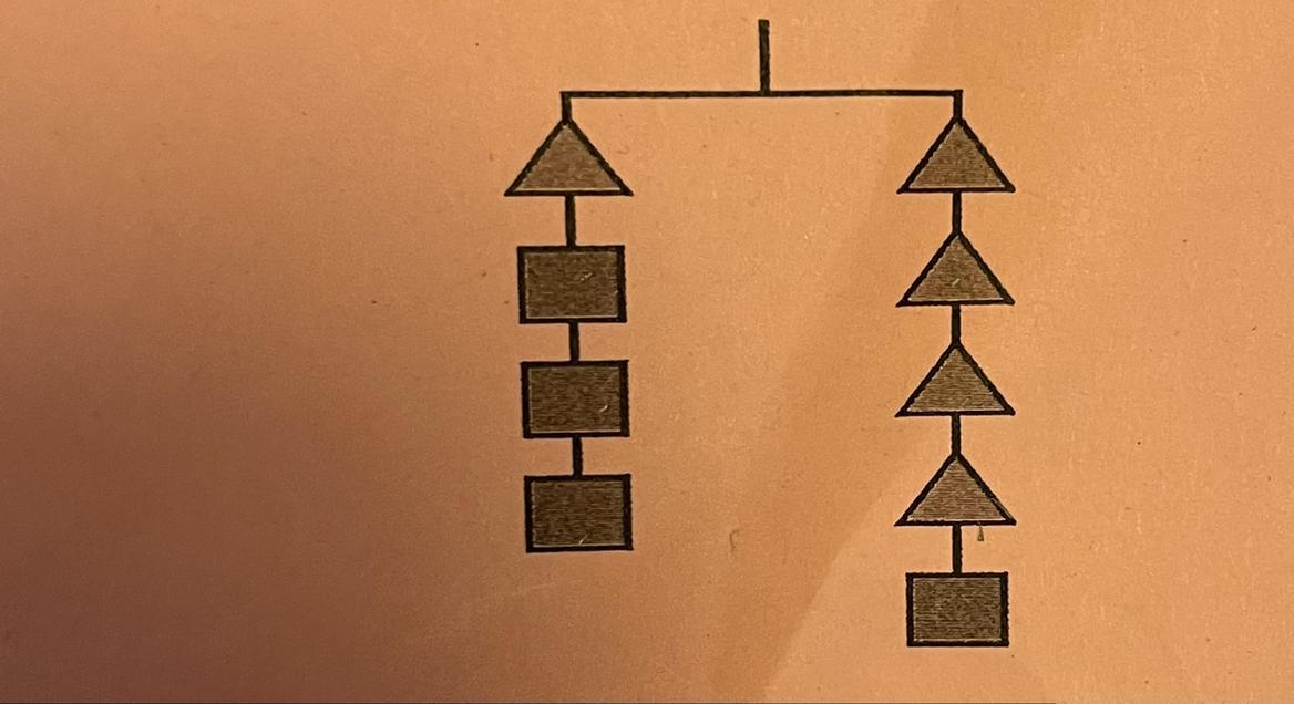 In this hanger, the weight of the triangle is x and the weight of the square is y.