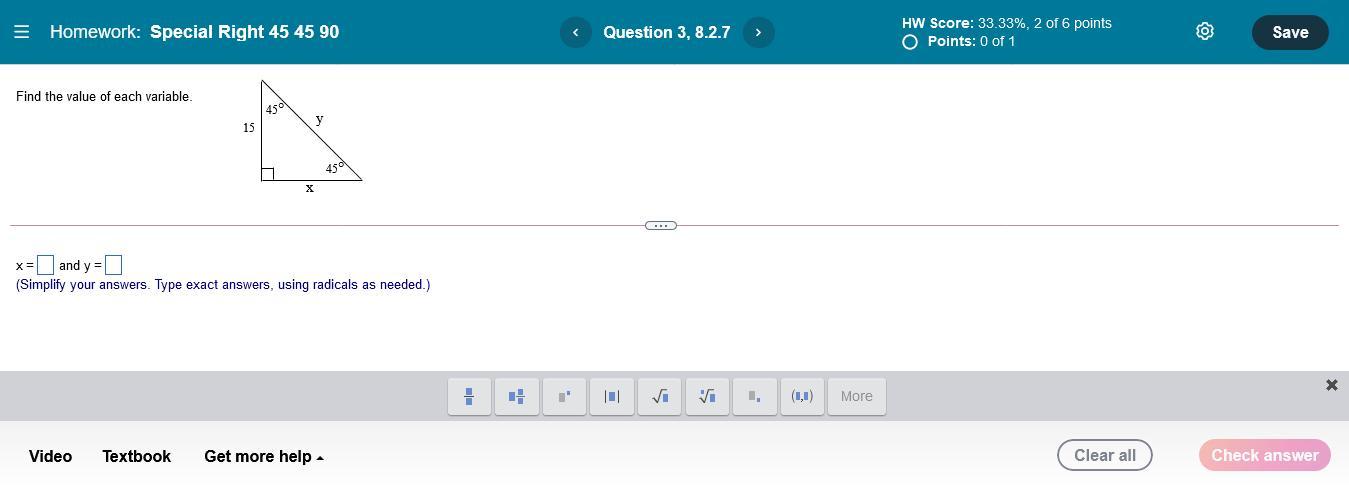 We are given a diagram of a <u>45°-45°-90° right triangle</u>, for which one of its legs has a measure of 15. The prompt also requires us to determine the values of the right triangle's other leg (x), and hypotenuse (y).