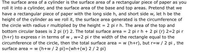 The surface area of a cylinder is the surface area of a rectangular piece of paper as you roll it into a cylinder, and the surface area of the base and top areas. Pretend that we have a rectangular piece of paper with the long side h, and short side w, let h be the height of the cylinder as we roll it, the surface area generated is the circumference of the circle with radius r multiplied by the height = 2 pi r h. The area of the top and bottom circular bases is 2 pi (r) 2. The total surface area = 2 pi r h + 2 pi (r) 2=2 pi r (h+r) to express r in terms of w , w=2 pi r the width of the rectangle equal to the circumference of the circle, then the total surface area = w (h+r), but r=w / 2 pi , the surface area = w (h+w / 2 pi)=(wh+(w) 2 / 2 pi)