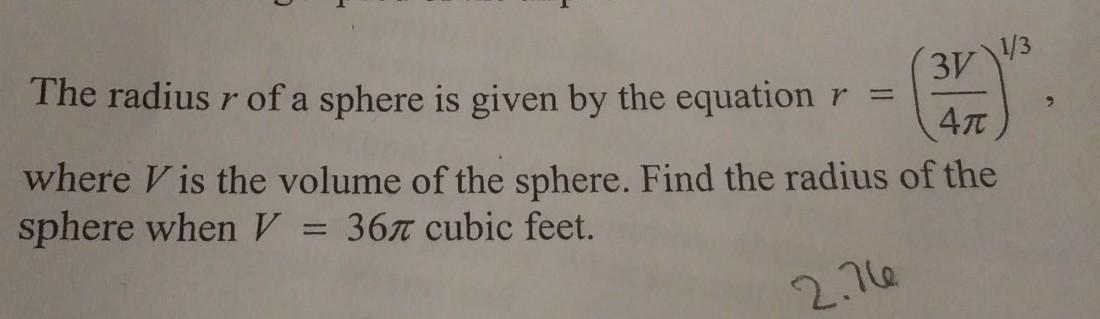 r = (3(36) (π) / (4) (π)) ^ ⅓