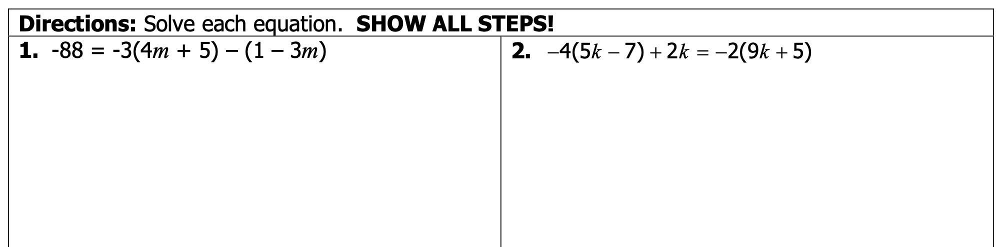 2. -4(5k - 7) + 2k = -2(9k + 5)