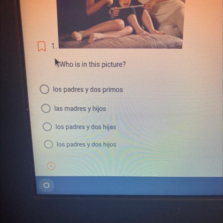 From what i can see it's a mom and dad with a child. Based on the options their most be a second child in the photo we can't see. So if both of the children are girls the answer is los padres y dos hijas, but if one child is a boy then it's los padres y dos hijos.