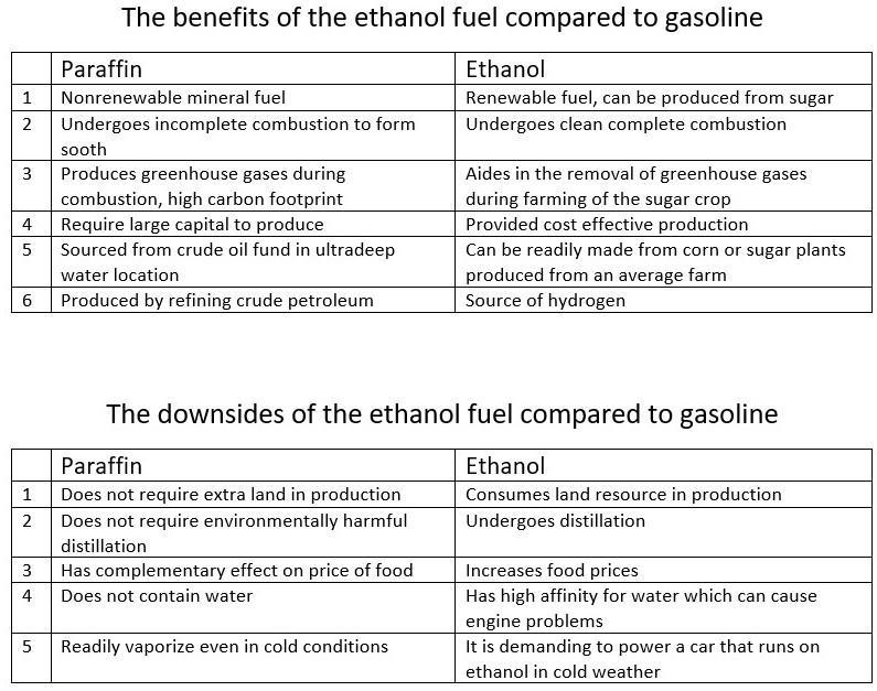 Paraffin combustion produces more energy per gram than ethanol fuel but paraffin fuel has a larger carbon footprint