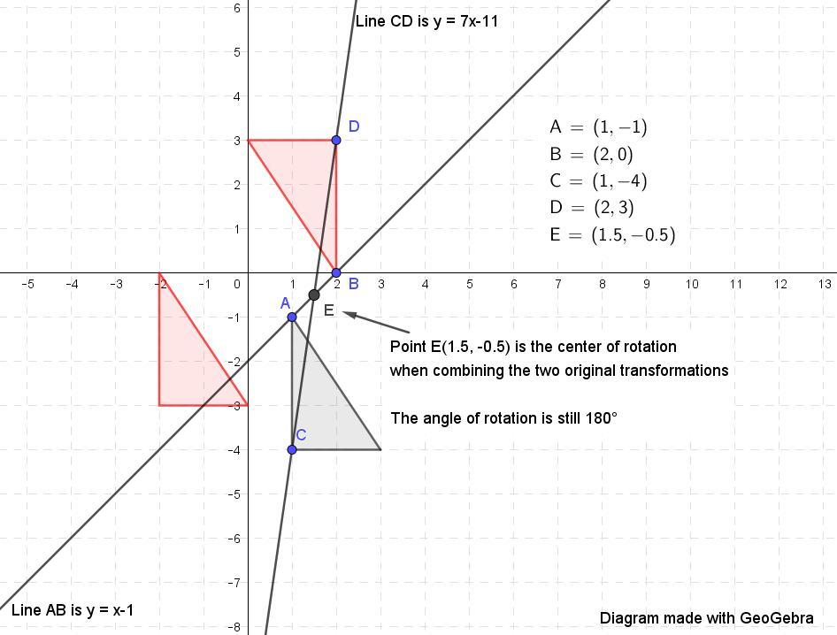 Point E is the center of rotation when we combine the translation along with the original rotation.