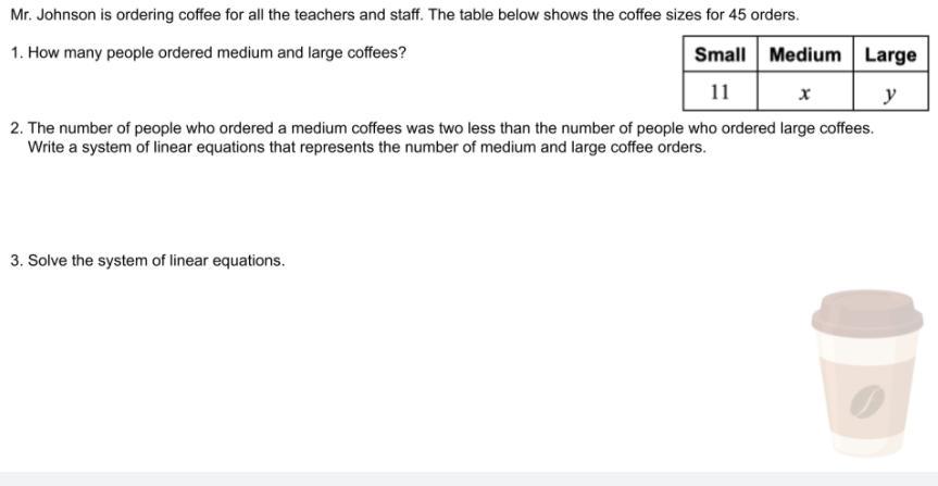 x = y -2 . . . . . . . . . . 2 fewer medium orders than large
