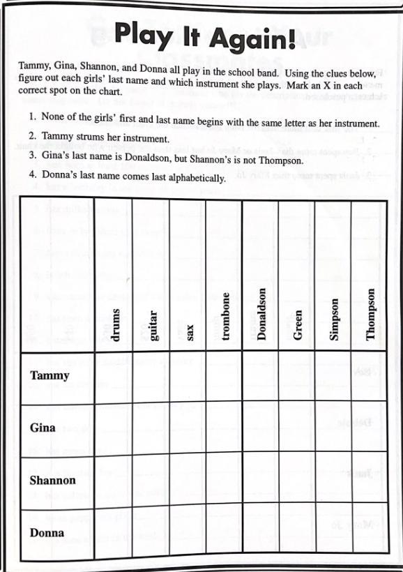 We move to clue 2, highlighted in blue. Eliminates drums and sax, meaning Tammy plays guitar. This also means we can eliminate the others playing guitar