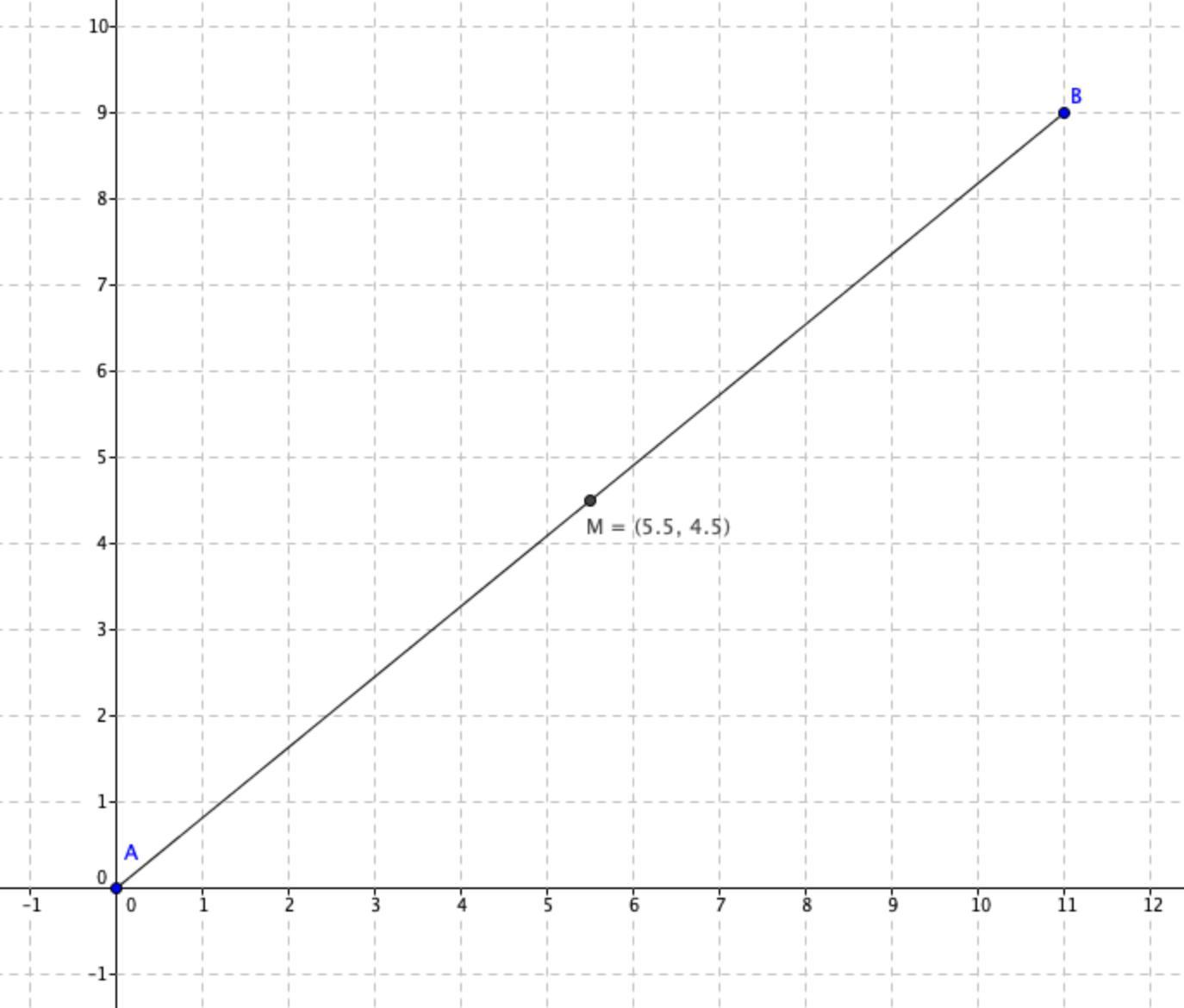 ((0, 0) +(11, 9))/2 = (11, 9)/2 = (5.5, 4.5) . . . midpoint