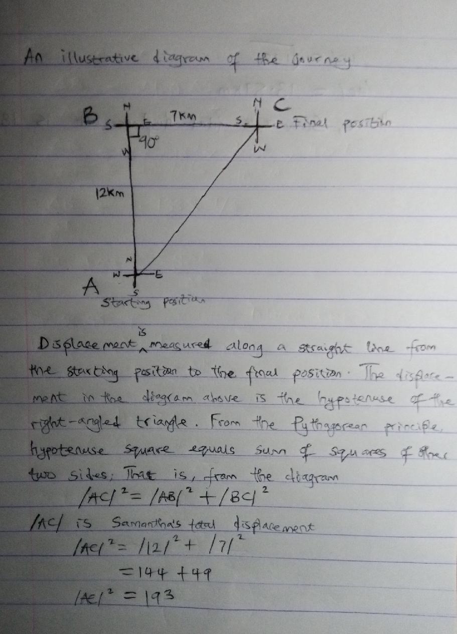 Answer: Samantha's total displacement is 13.89km