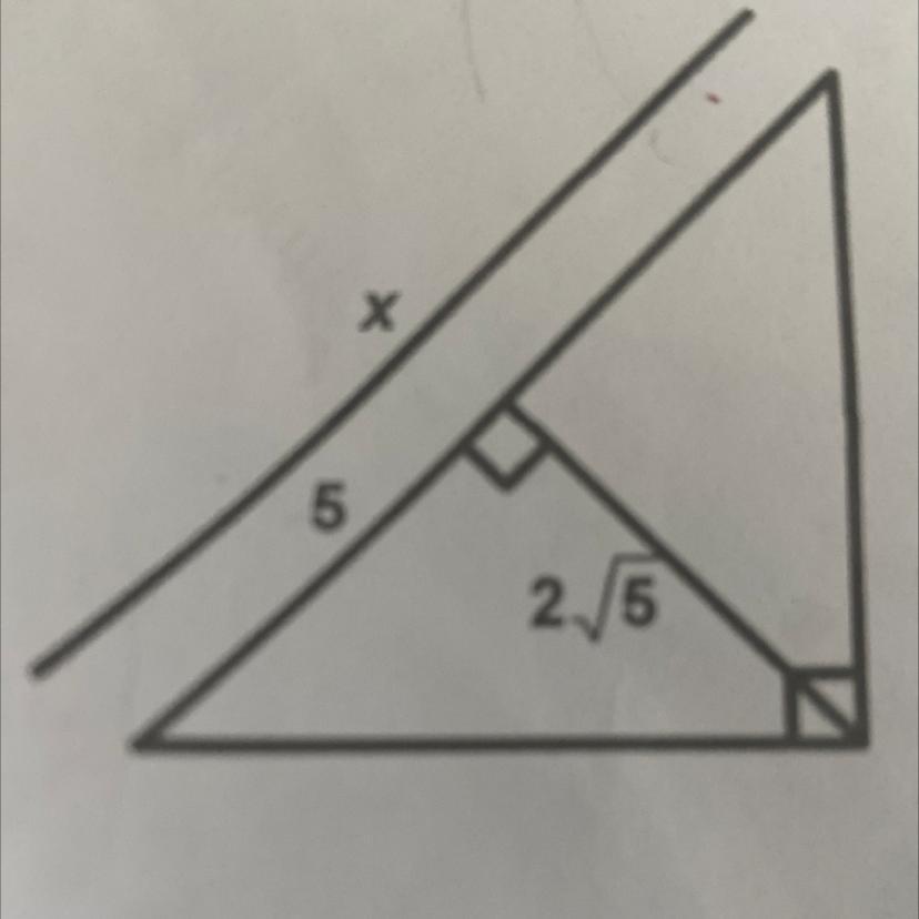 The two sides marked with numerical values have lengths 5 and 2√5 ≈ 4.47. The remainder of x, which is (x-5), will be shorter than either of the other two marked lengths. This means we can write the ratio of short side to long side of the two smaller triangles as ...