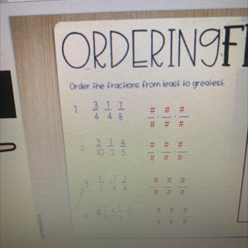 1.) As I mentioned before, the bigger the denominator; the less it's value. In this situation, 1/4 would be the smallest. The fraction 3/4 is greater than 1/4. But because 7/8 is is greater than 3/4, because 6/8 equals 3/4. The fraction 7/8 is greater than 6/8, therefore making 7/8 being the greatest fraction. So, least to greatest looks like this: