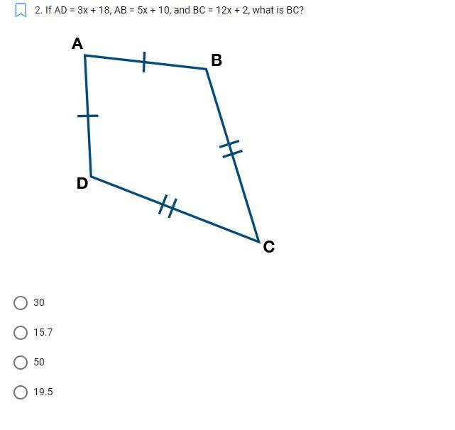 If AD = 3x + 18, AB = 5x + 10, and BC = 12x + 2, what is BC?