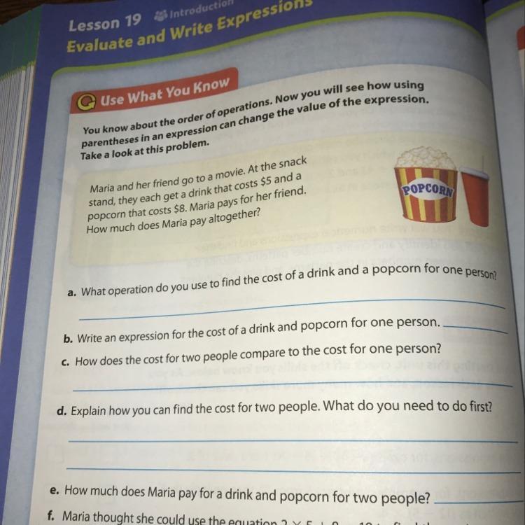 What operation do u use to find the cost of a drink and a popcorn for one person?