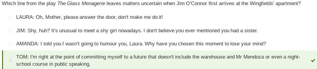 Which line from the play The Glass Menagerie leaves matters uncertain when Jim O’Connor first arrives at the Wingfields' apartme