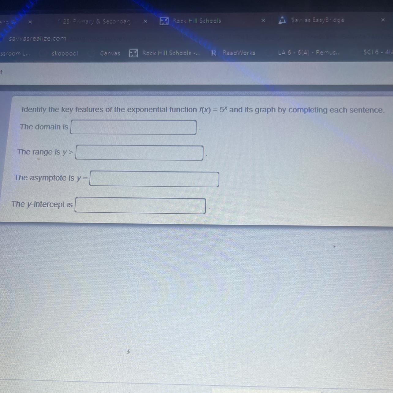 The <u>y-intercept</u> is the y-coordinate of the point where the curve crosses the y-axis, i.e. when x = 0. If you input x = 0 into the function y = 5^x you get y = 1. Therefore, the y-intercept of y = 5^x is y = 1