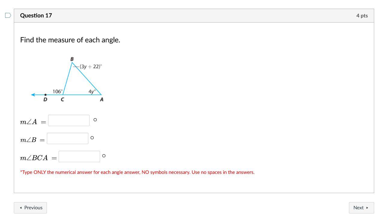 ∠BCA = 106° , ∠B = 3y + 22 and ∠A = 4y