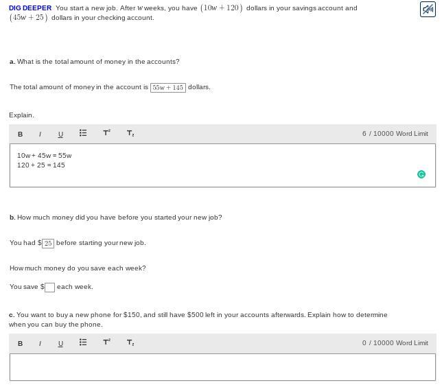 First problem looks right. Although he started with 145, not 25. Savings and checking combined is the total amount of cash he had before he started working, which is why it's added to the total amount of money he has.
