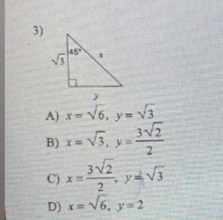 because for a 45-degree right triangle the two legs are the same and because the legs are sqrt 3, it is sqrt 6