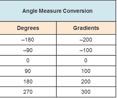 The table showing the conversion of angle measure in degrees to angles in gradients is attached below.