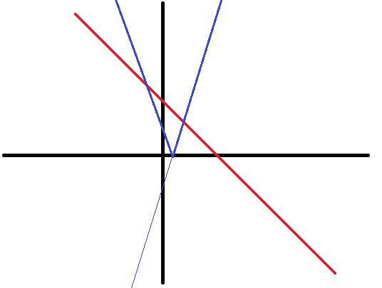 Solving the equation is equivalent to answer "when is the blue line higher than the red one?" Which obviously happens outside the two intercept points. Let's find the first coordinate of both - we don't really care what's the y coordinate of either point.